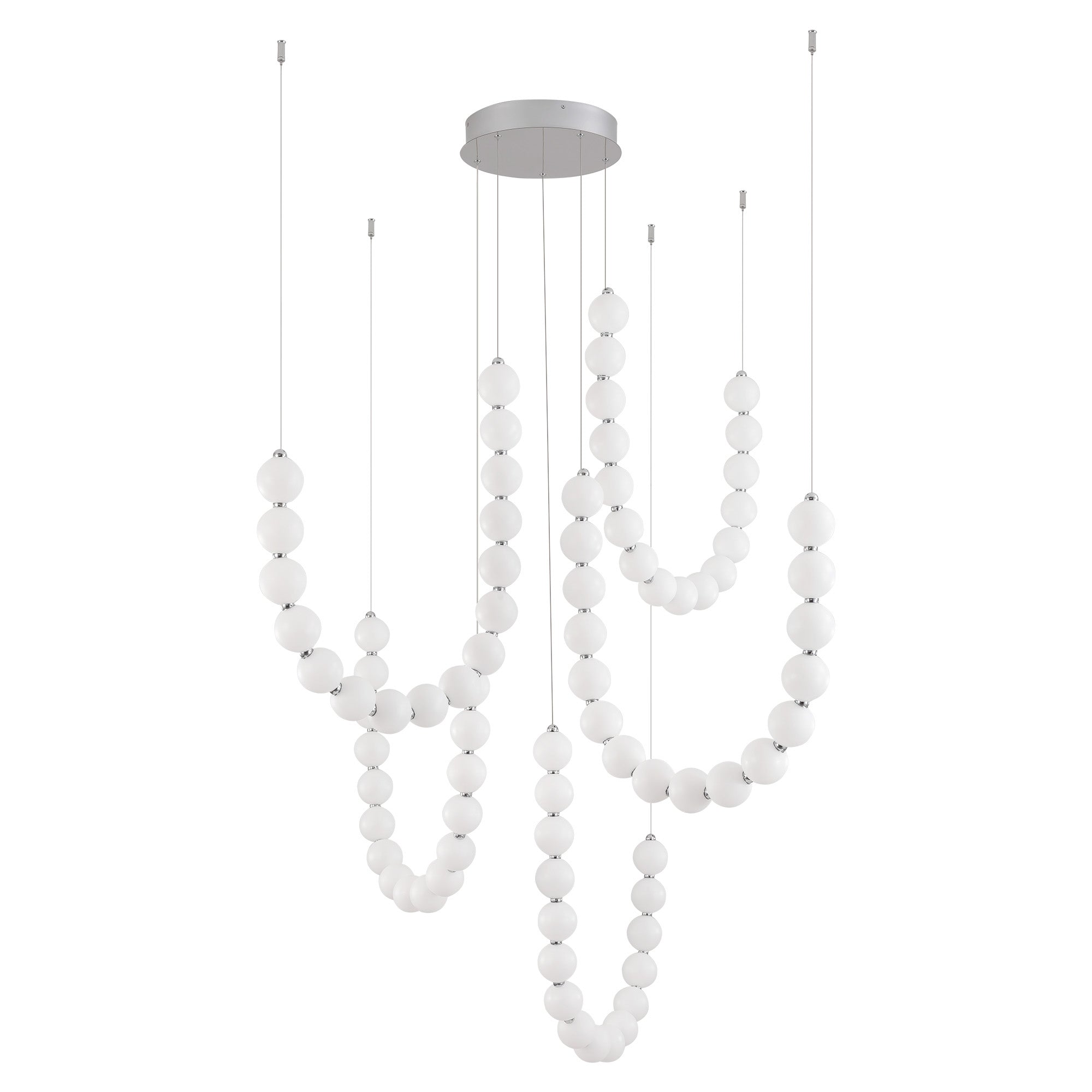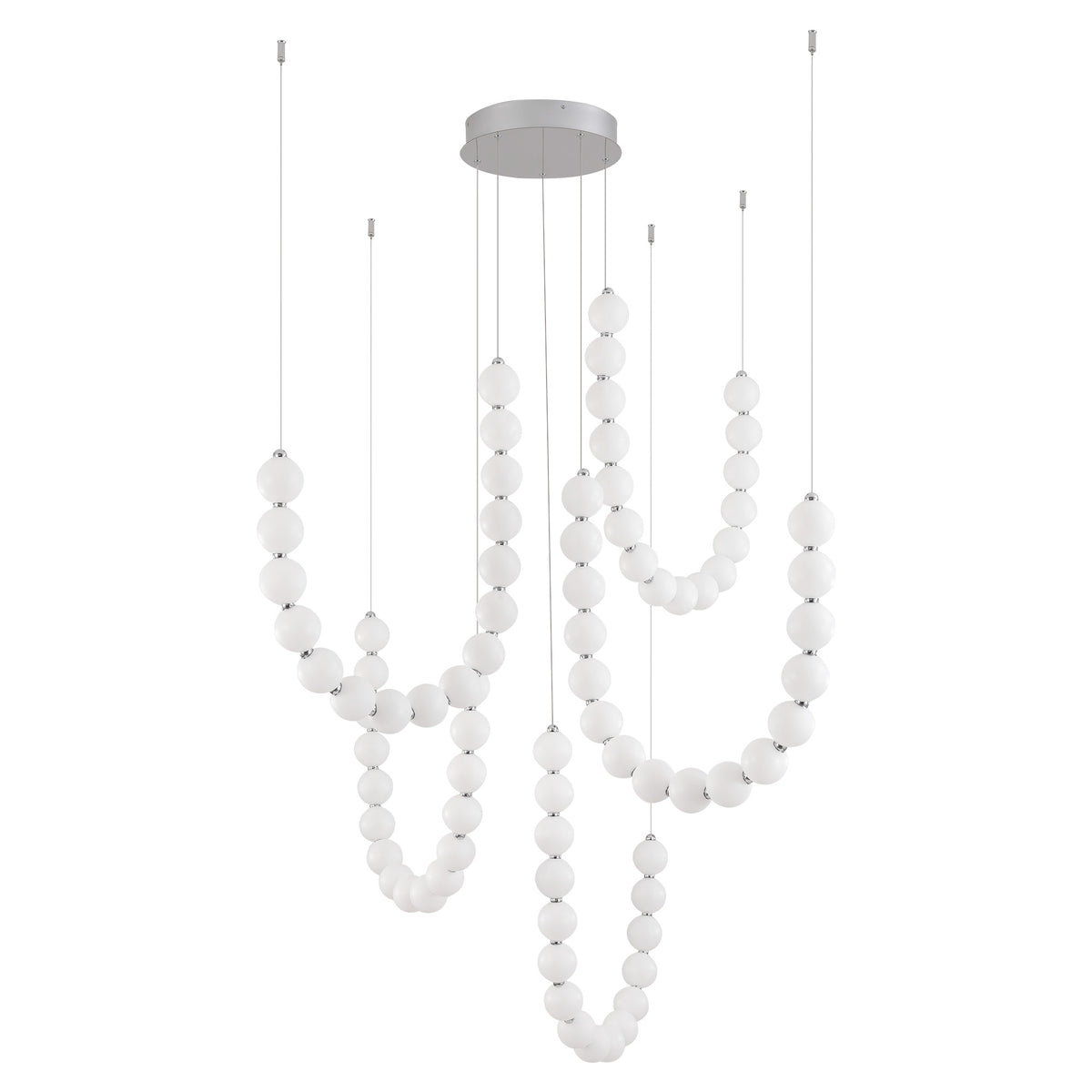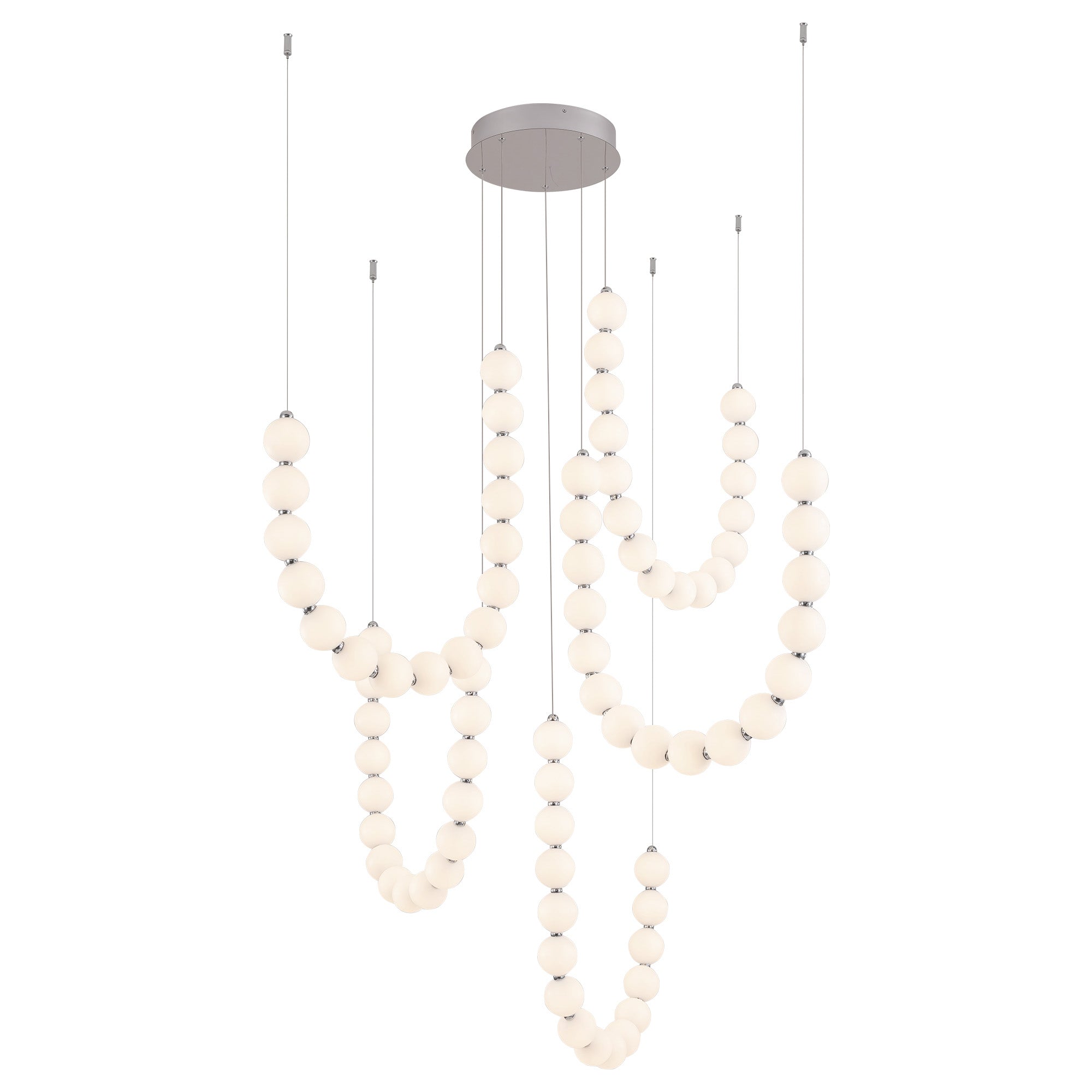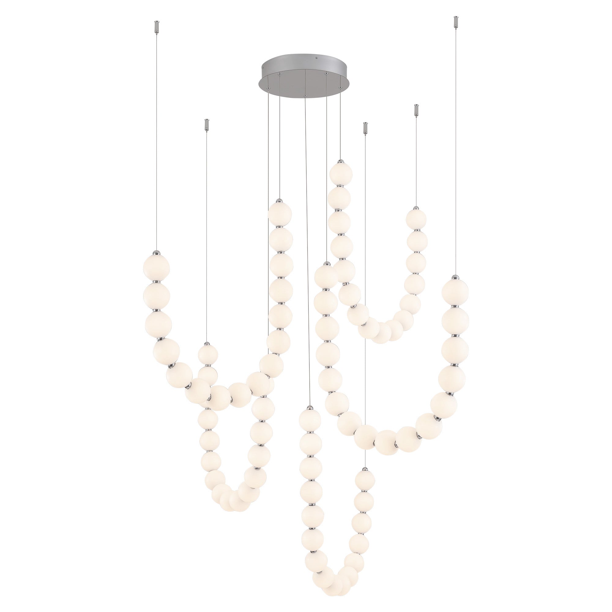 Inspired by the luxe pearls discovered by the sea, the Akoya collection is an instant classic. With unlimited amounts of configurations, this collection is perfect for any space in need of an awe-inspiring statement piece. Beads of illumination twirl in any way you prefer on a subtle frosted polished chrome frame. It will be the jewelry of any space.