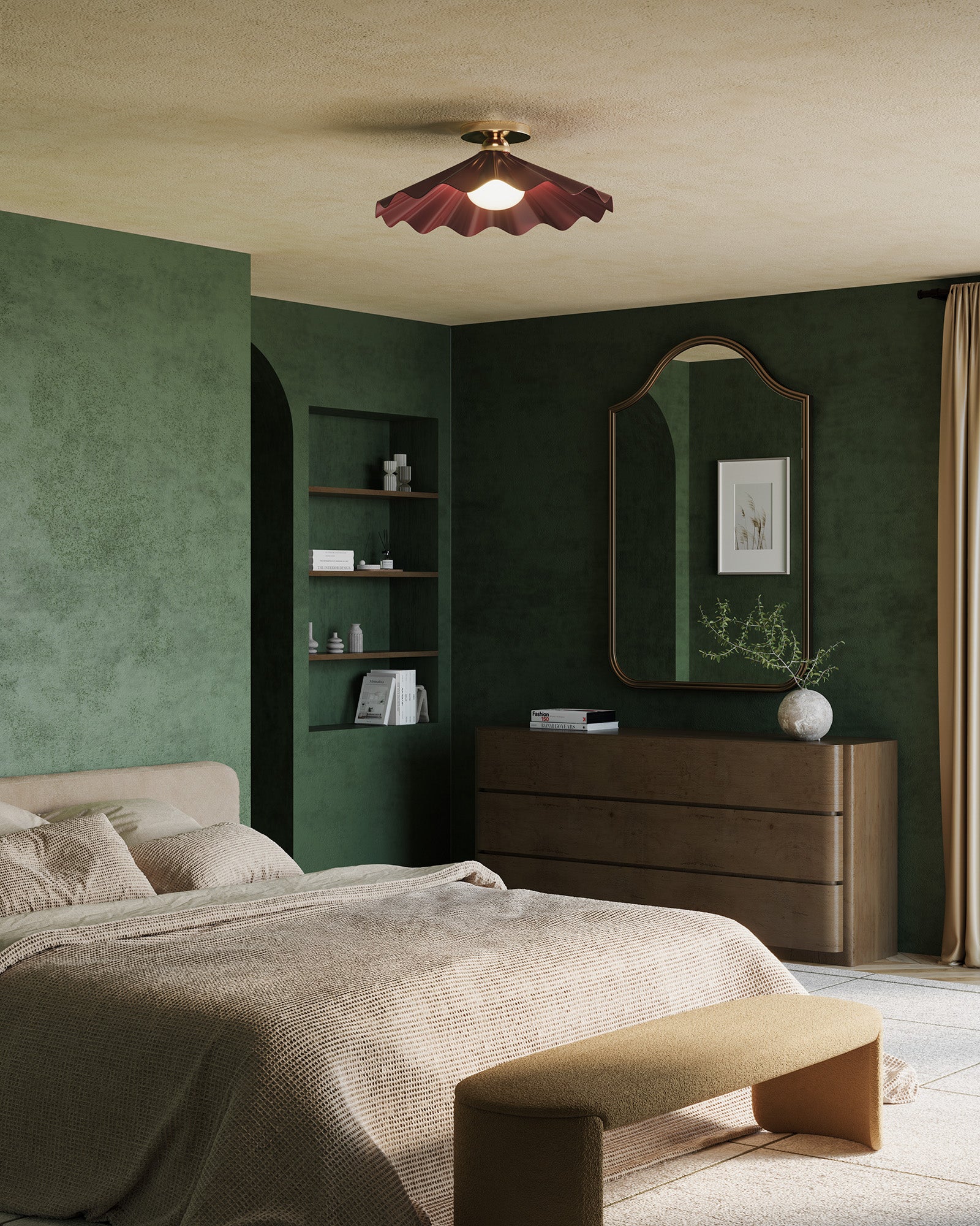 Inspired by the Tridacna gigas: the world’s largest clam and source of the most extraordinary pearls. This collection celebrates the beauty of rarity and reveal. Oblong, pearl-like opal glass diffusers rest atop ruffled metal “shells,” painted in rich hues of burgundy, pine green, and dusty peach. The forms echo the ancient shell game, a dance of deception and discovery, where anticipation meets allure. Select pieces, including the table lamp, floor lamp, and wall sconce, incorporate deep walnut wood, adding warmth, texture, and timeless sophistication to the collection’s sculptural elegance.