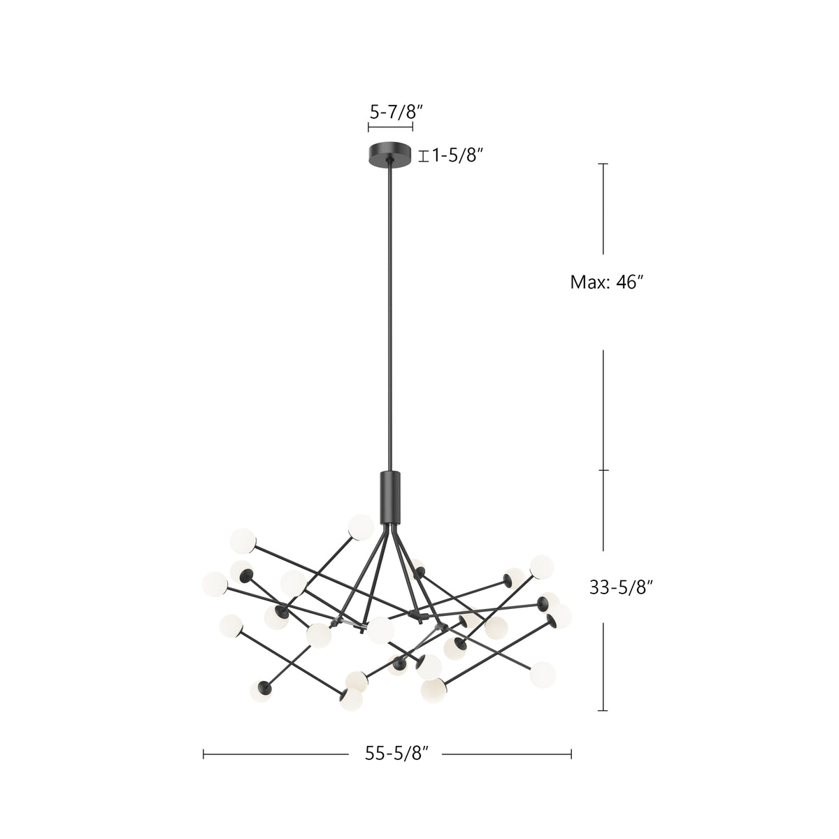 A chaotic constellation of radiant globes seemingly levitate about the center of the Moto geometric structure. Fine intersecting metal arms project the opal glass globes from the gravitational center and allow for positional adjustment during assembly. The contemporary statement piece is available in two sizes.