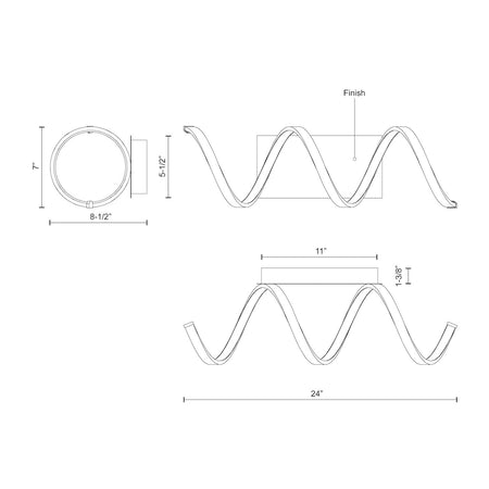 A looping radiant line casts light across space in a continuous helical path. The Synergy series is characterized by the rolled rectangular extrusion, which emits soft light through the silicon opal lens. Configured in both linear and ring arrangements, the arcing aluminum allows the curated finishes to be visible at every angle.