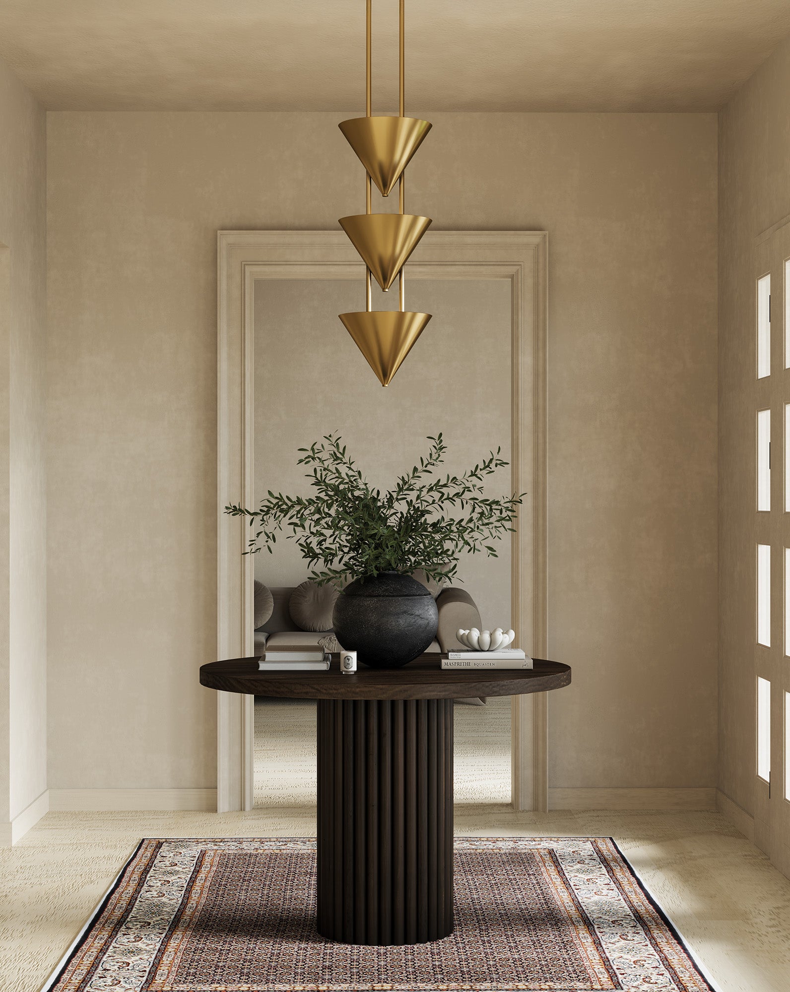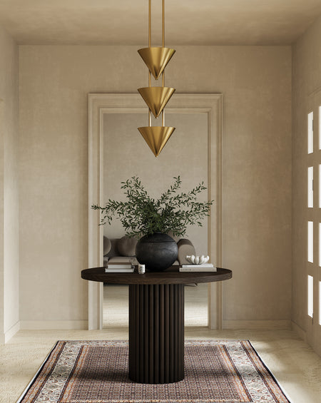 Versus is a study in contrast, translating the human form into sculptural lighting. Strong metal cones in a range of luxe finishes are anchored on faux stone columns that resemble soapstone, each tipped with a fashion-forward finial for visual intrigue. Inspired by the surrealist art of Leonora Carrington, the collection evokes slender, sharpened silhouettes that occupy space like ethereal figures or walking obelisks. The shapes recall heads, tilted chins, and leaning brows, creating a dramatic interplay of form, shadow, and scale. Versus continues a design exploration begun in 2007, celebrating contrast, elegance, and subtle wit—a nod to the timeless jest of Spy vs Spy and the enduring power of sculptural storytelling in the home.