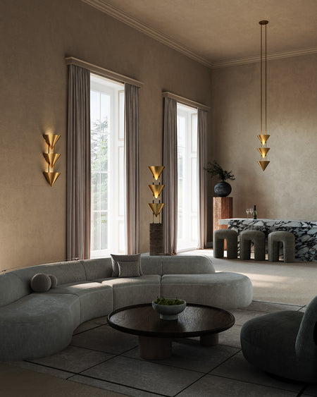 Versus is a study in contrast, translating the human form into sculptural lighting. Strong metal cones in a range of luxe finishes are anchored on faux stone columns that resemble soapstone, each tipped with a fashion-forward finial for visual intrigue. Inspired by the surrealist art of Leonora Carrington, the collection evokes slender, sharpened silhouettes that occupy space like ethereal figures or walking obelisks. The shapes recall heads, tilted chins, and leaning brows, creating a dramatic interplay of form, shadow, and scale. Versus continues a design exploration begun in 2007, celebrating contrast, elegance, and subtle wit—a nod to the timeless jest of Spy vs Spy and the enduring power of sculptural storytelling in the home.